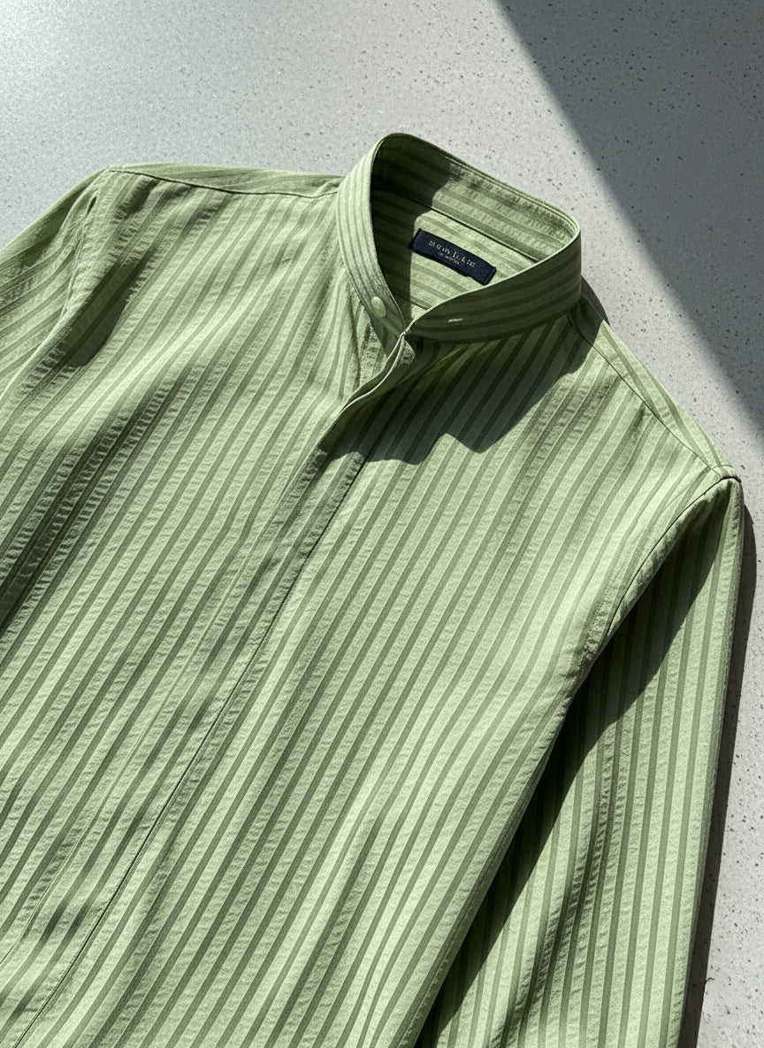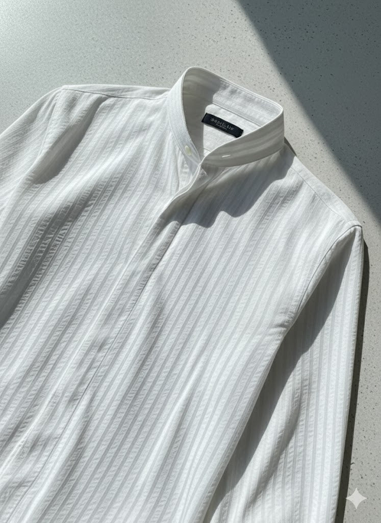 Step into elevated refinement with the Celestia Ridge Mandarin Shirt — where minimalism meets bold presence. This limited edition piece features a sleek mandarin collar that redefines modern-classic menswear with understated authority. Crafted from imported premium fabric, the shirt offers a smooth, breathable texture with a structured silhouette designed to impress from boardroom to evening outings.