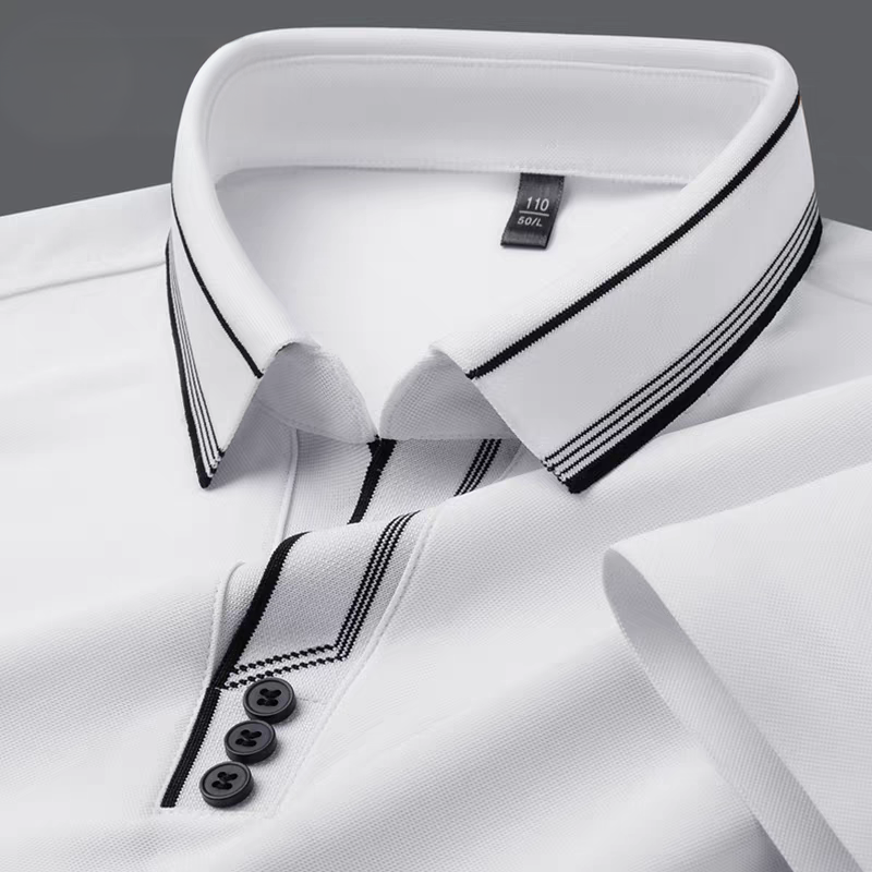 Refined Polo Design – Featuring a tailored fit, striped collar, and button placket for an elegant, versatile appeal.